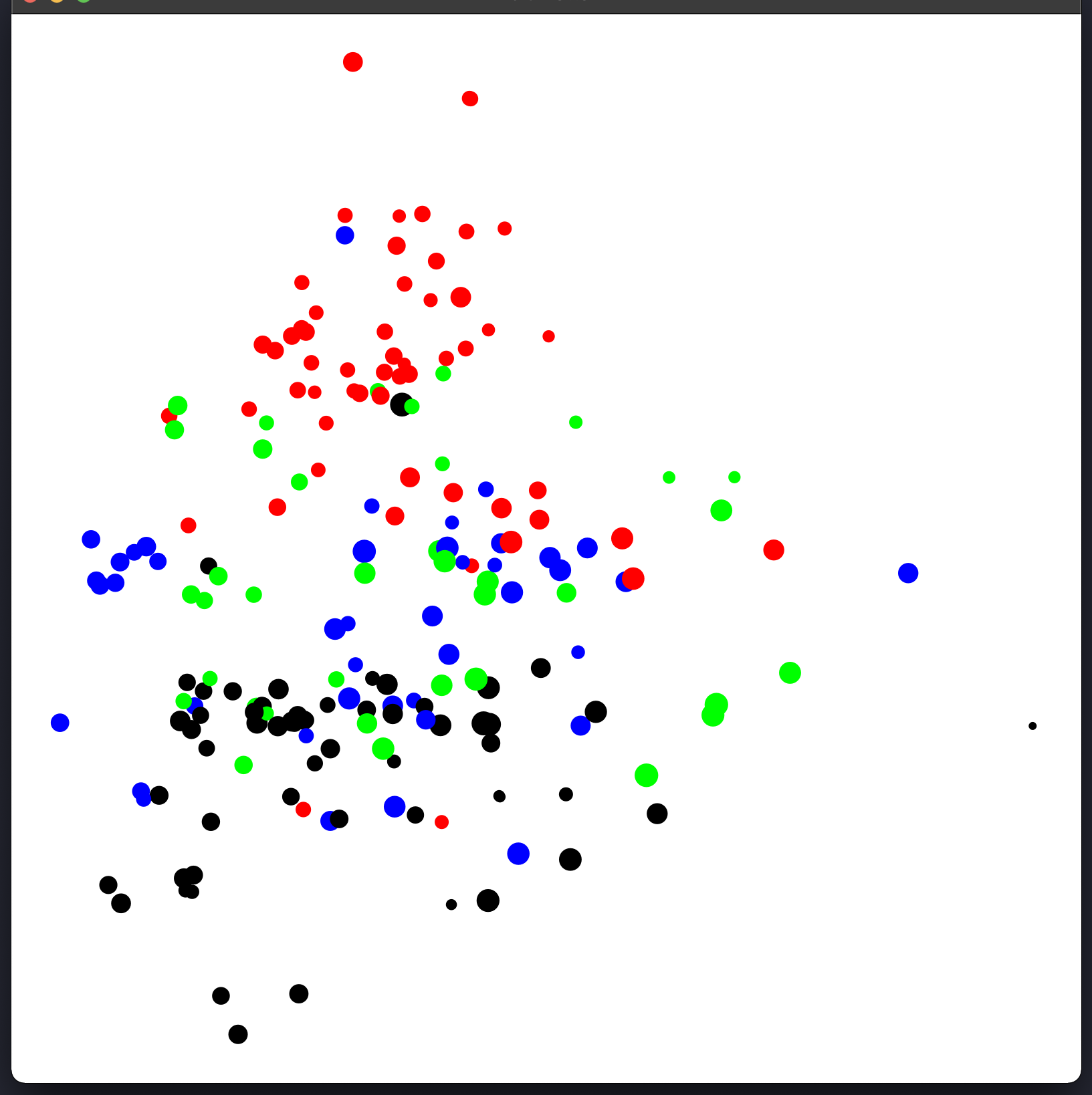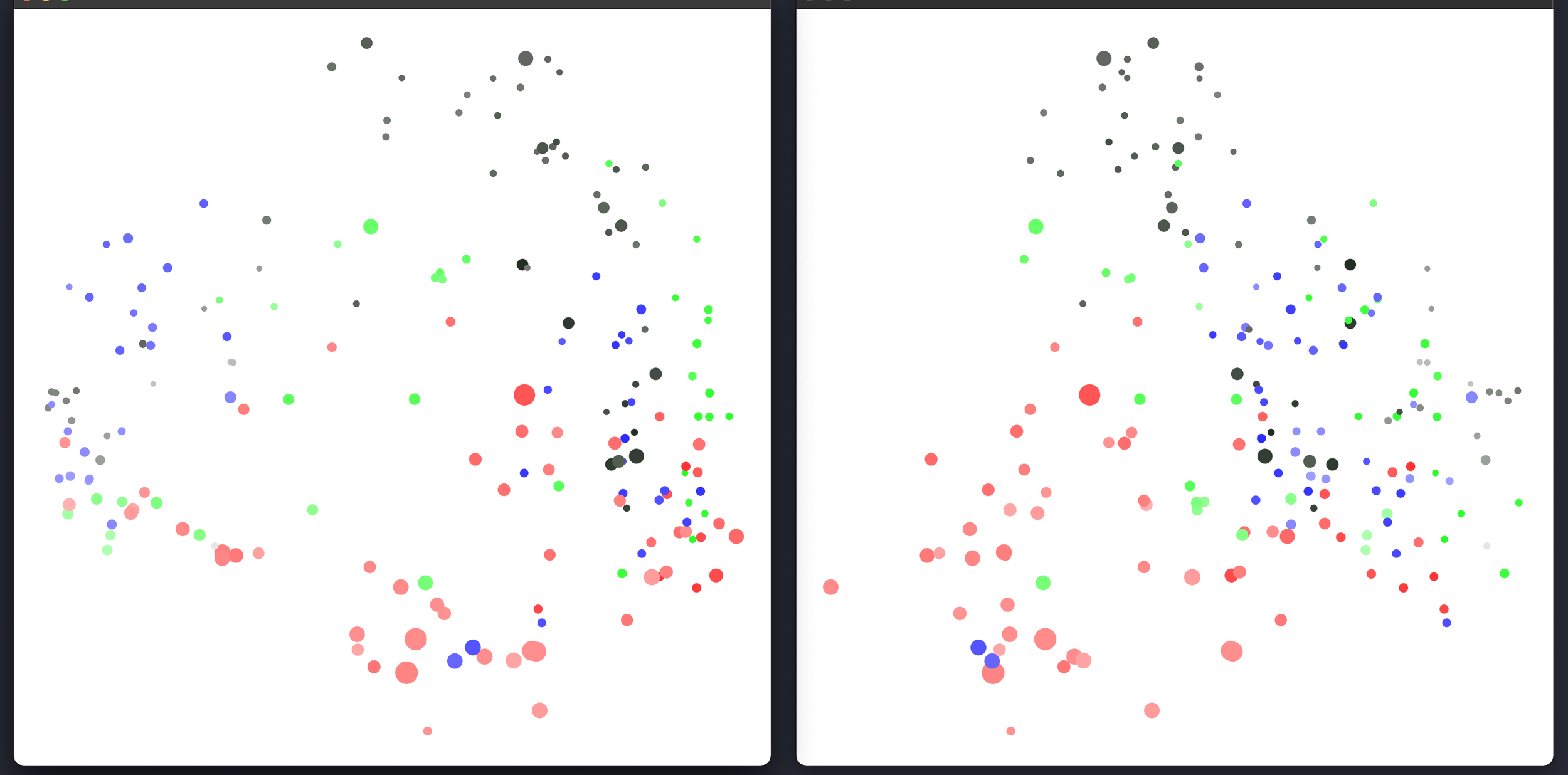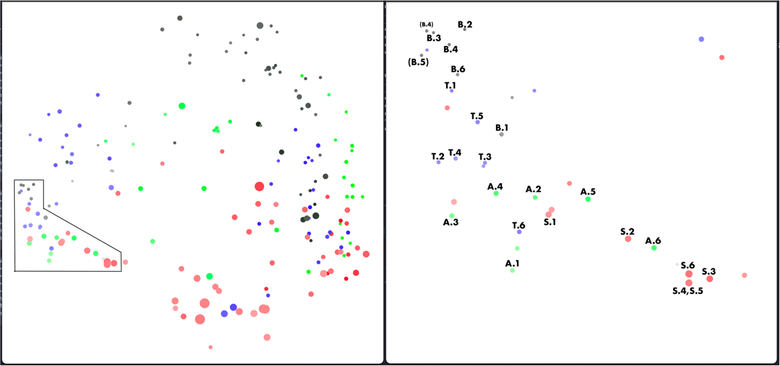 Figure 1 presents the entire collection of multiphonics from the q-phonics catalog. The plots were created with FLUCOMA in SuperCollider (McCarthy, 2018). As mentioned above, each plot is also a sampler that allows playback so that one can hear a segment of each of the analyzed sounds by clicking on one of the points. This timbre-senstive, topological representation allowed me to listen to each of the points in the search for similar, compatible, or even contrasting sounds. In Figure 1, the distribution of sounds—arranged according to the normalized averaged minima and maxima—is the result of the analysis of the 13 MFCCs for each of the multiphonic sounds. The color intensity for each colour maps the relative loudness, and the size of each datapoint gives an estimate of fundamental frequency from low (small) to high (big). The latter were added to convey more information in addition to the spectral characteristics since timbral similarities from MFCC’s are not exclusively bound to pitch. In figure 1, four dimensions are represented in to plots by projecting the positions onto dimensions 1 and 2 on the image on the left, and dimensions 3 and 2, on the image in the right whereby the first and third dimensions are placed along the x-axis and the second dimension along the y-axis.
