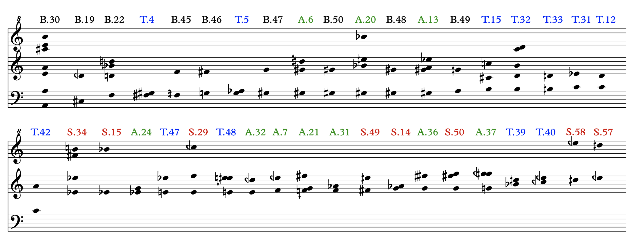 Figure 3 presents the constituent pitches of the first collection of multiphonics from the q-phonics catalog arranged from low to high according to the lowest pitch of each sound. The colouring scheme for the labels follows that of the timbre space. This collection contained at least three discernible multiphonic types: one category of sounds consisting of a clear-sounding, narrow interval such is the case for multiphonics T.12, T.31, T.32, T.33, A.24, A.31, etc.; another category entails narrower intervals (minor and major seconds), which produce audible beatings (T.4, T.5, S.14…); and a final category with wide intervals (major seventh, minor ninth: B.45, B.46, B.47, B.50, T.47, T.48, A36, A.37, S.57, S.58). The multiphonics in Figure 3 match Riera et al.’s classification of bichord, and biharmonic multiphonics, respectively. The latter group of multiphonics are denominated “sons nuages” (cloud-sounds) due to their unstable, airy, and soft-sounding quality. I will expand on this category of multiphonics below.