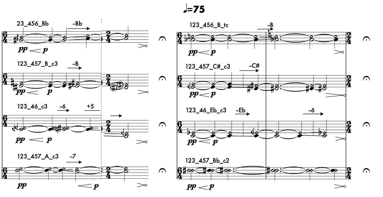 In the initial phase of the selection process, the criterion was based on the intrinsic appeal of the multiphonic sounds. I focused on those featuring narrow intervals, clearly discernible pitches, and soft dynamics (p–mp). I then queried the database for multiphonics that shared pitches across two or three instruments, adjacent multiphonics with similar timbral characteristics, and combinations that blended well together. Based on these considerations, I compiled an initial collection. Using the analysis software Spear, I conducted spectral analyses of each sound, considering only the most prominent spectral peaks. The selected multiphonics were then arranged from low to high, according to the lowest note in each sound (Figure 3).