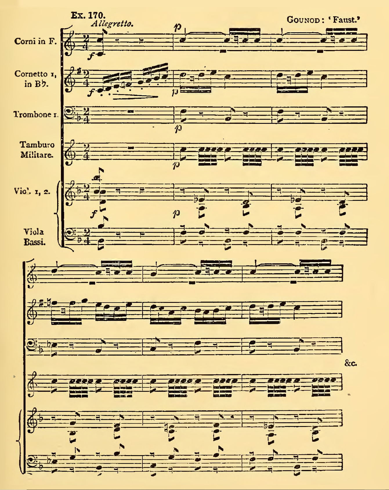 Prout, 1899 (vol.I), p. 217 [Note: An example from the Kermesse Scene of Gounod's "Faust" demonstrating a solo cornet melody. It is accompanied by strings, horns, trombone and snare drum in such a way that is, according to Prout, "so clear as to need no comment.]